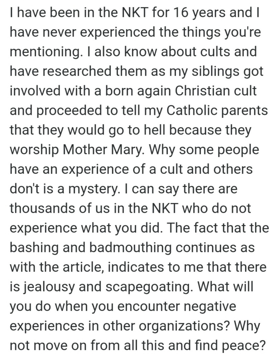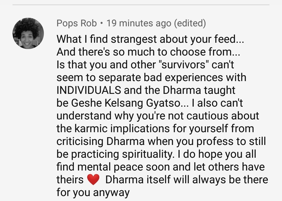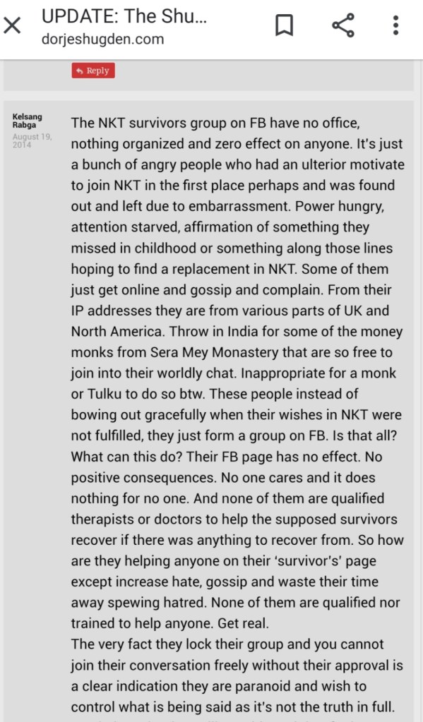 Due to the group narcissism, there is a pervasive view that those outside the NKT are not on the correct spiritual path (and are therefore on some level, inferior). It is therefore likely that they will attack critics through comments that come across as patronising and superior. For those who are still in the ‘love bombing and flattery’ early stages of involvement with the group, and who experience relief due to the spiritual bypassing, it may be difficult for them to understand why people would become critical of the NKT and its practices.