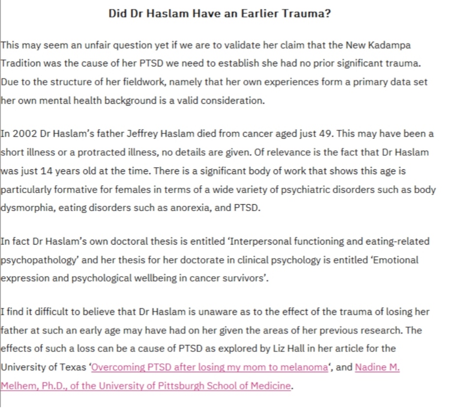 This is an example of an ad hominem attack to avoid engaging with the idea that there could be any psychological damage caused by involvement with the NKT. ‘Dr Robert Harrison’ suggests that I am not aware of the impact of my own fathers illness and death. I don’t include all the information on my history because it would be very revealing to type it all up in detail and survivors may not find this relevant to their own recovery. I am aware that I had pre-existing trauma and would argue that if I hadn’t, it is unlikely that I would have been drawn into the NKT.