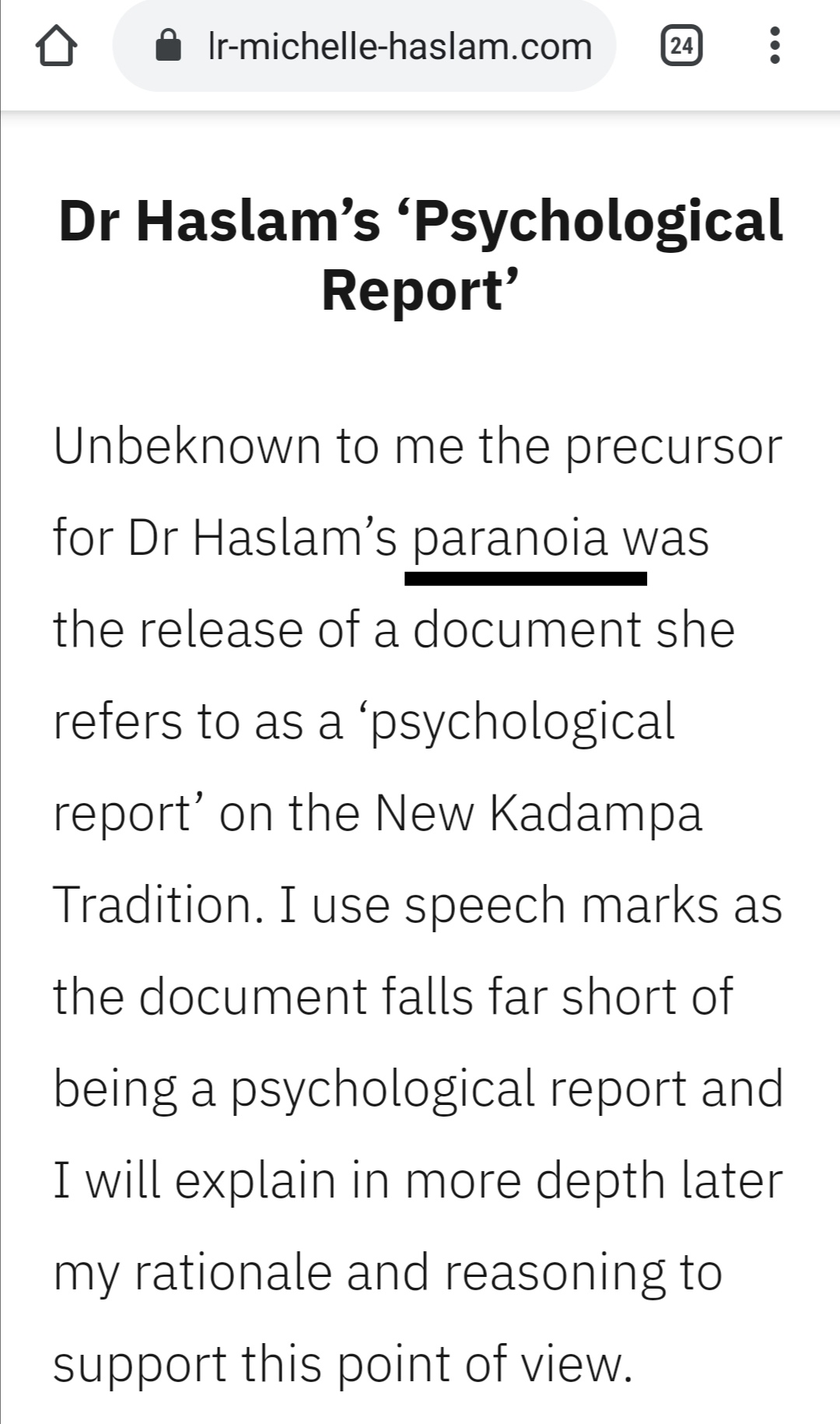 The day after I released version 1 of my psychological analysis of the NKT someone emailed my supervisor using the fake identity Dr Robert Harrison to threaten me and my workplace. Details are here. Following my release of this email the URL http://www.dr-michelle-haslam.com was bought and an entire defamation website was written (screenshots below). Due to the use of a fake identity I cannot prove who is responsible, former members believe this was senior members based at Manjushri, the ‘mothercentre’ and where the internet office is based, however this cannot be proven.