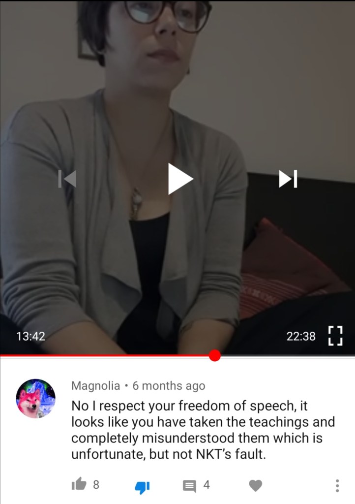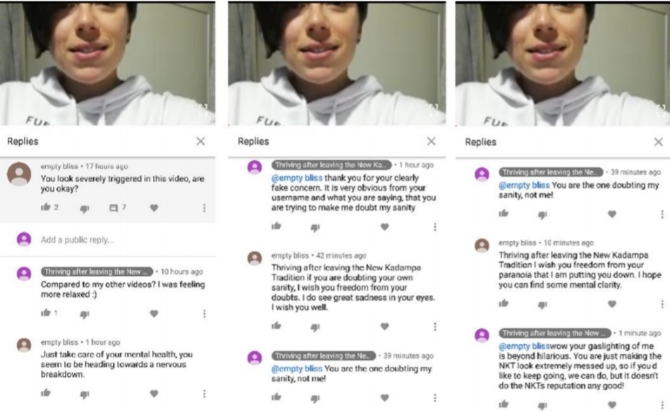 NKT members are known to attempt to make critics question their mental clarity and sanity. In the below screenshot ‘Empty Bliss’ attempts to do this and then suggests I am paranoid for thinking that they are not being genuine. These comments were deleted quickly, which may have been to make me doubt my own memory, or to save the NKTs reputation as gaslighters of people’s mental state.