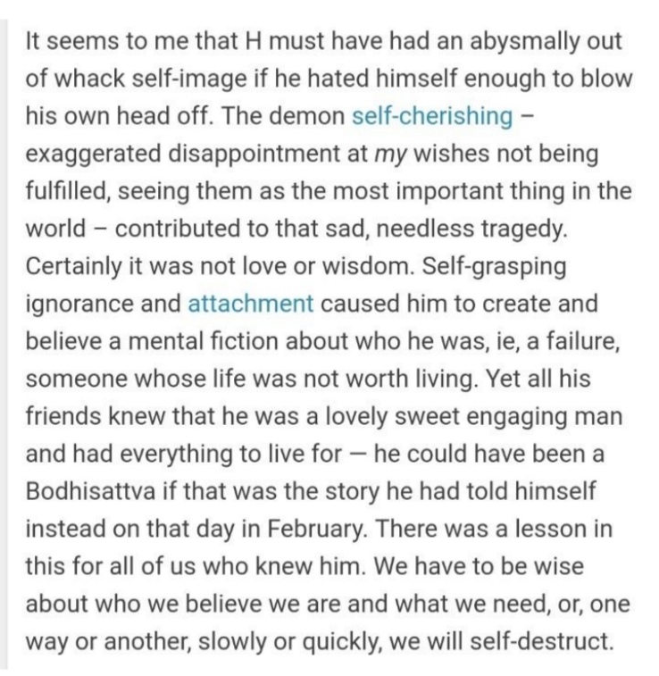 In addition, some survivors, including myself, report that they were gaslighted until they experienced suicidality. (See my testimony for evidence). Survivors report that they were told that their suffering was simply due to a lack of mental clarity, incorrect perception, or ‘self-cherishing’. Survivors report that when their mental health deteriorated they were treated with indifference, coldness, and at times, spoken to as if they were inferior due to their difficulties. I believe this is reflected here, in an ex-senior teachers’ reflections on a friends suicide: